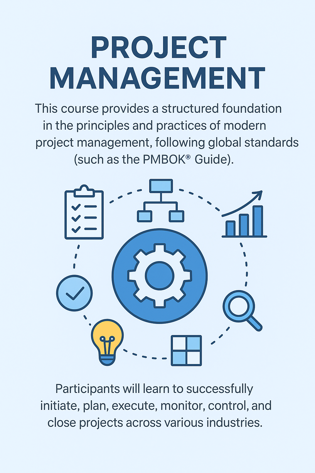 This comprehensive course provides a structured foundation in the principles and practices of modern project management, following global standards (such as the PMBOK® Guide). Students will learn to successfully initiate, plan, execute, monitor, control, and close projects. The curriculum covers essential knowledge areas, including scope, schedule, cost, quality, risk, and stakeholder management, and introduces popular methodologies like Waterfall and Agile.